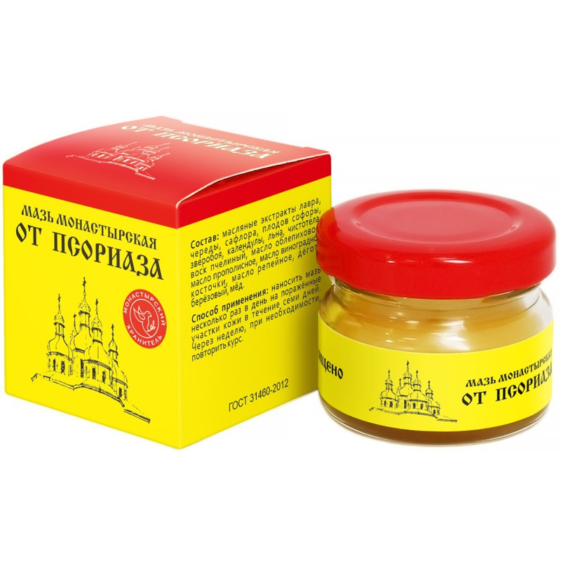 Природные компоненты, входящие в состав монастырской мази "От псориаза", с давних времён используются в народной медицине при псориазе, дерматитах, нейродермитах, экземах, лишаях, могут помочь снять обострение в период воспаления, зуд, жжение, стянутость, очистить кожу от бляшек, смягчить и увлажнить её, принести долговременное облегчение при кожных заболеваниях.