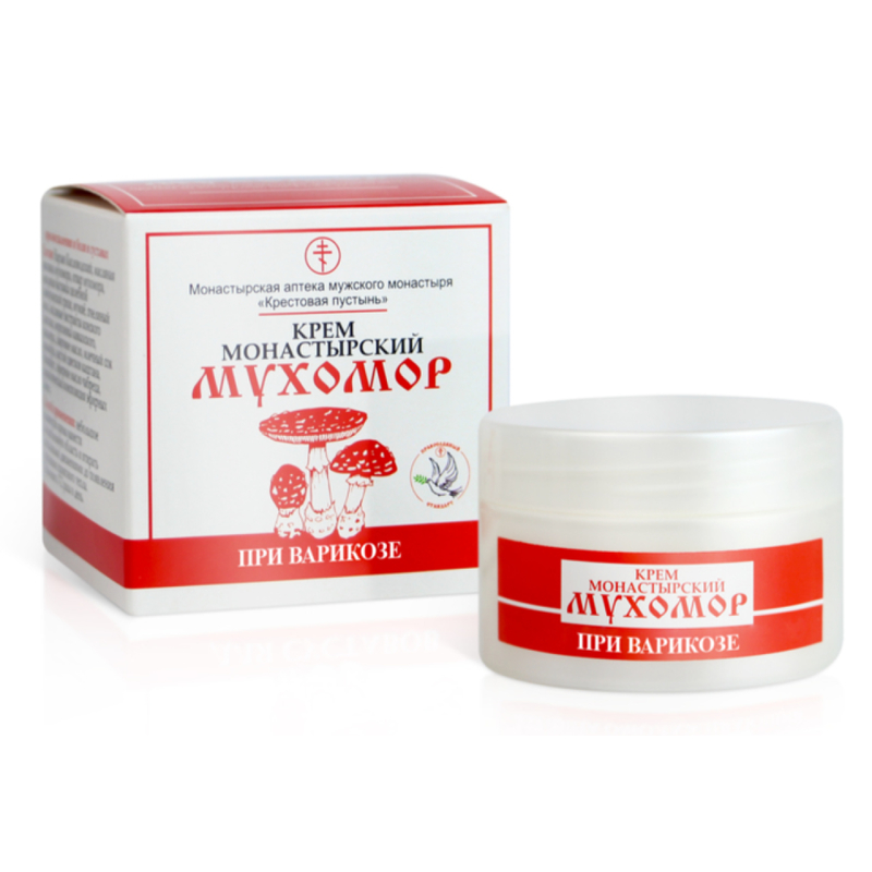 Крем «Монастырский мухомор» «При варикозе» создан на основе масляной вытяжки из мухомора и экстрактов лекарственных растений, которые активно применяются в народной медицине для восстановления сосудов. Компоненты, входящие в состав крема, могут восстанавливать правильный отток крови, повышать упругость и тонус стенок сосудов, снижать угрозу тромбообразования, уменьшать ломкость капилляров, улучшать работу венозных клапанов, стимулировать выработку коллагена, который отвечает за молодость и упругость кожи и сосудов, благодаря этому боль становится меньше, усталость проходит, а расширение вен постепенно уменьшается.