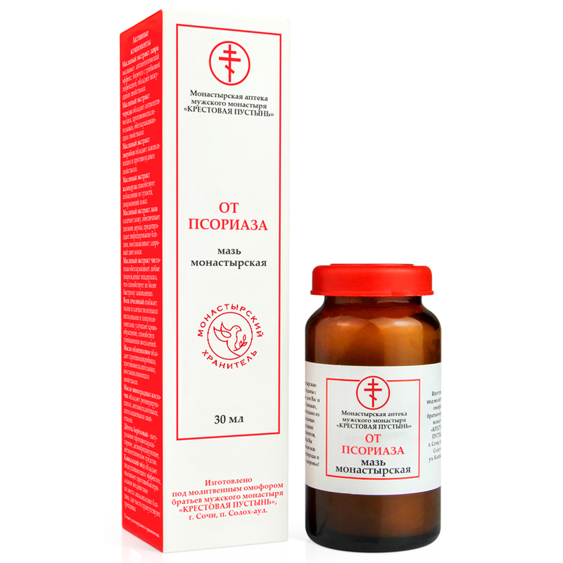 Природные компоненты, входящие в состав монастырской мази «От псориаза», издавна применялись при: псориазе, дерматитах, аллергических высыпаниях, экземе, лишае, аутоиммунных воспалениях, зуде.