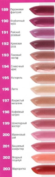 Восхитительная палитра из 15 тонов:189 Персиковая фантазия190 Клубничный мусс191 Райский розовый192 Кремовая роза193 Лакомый нектар194 Сливочный ирис195 Натюрель196 Латте197 Искристый металлик198 Кофейный каприз199 Шоколадный восторг200 Малиновый рай201 Вишневый конфитюр202 Ягодный поцелуй203 Маргаритка