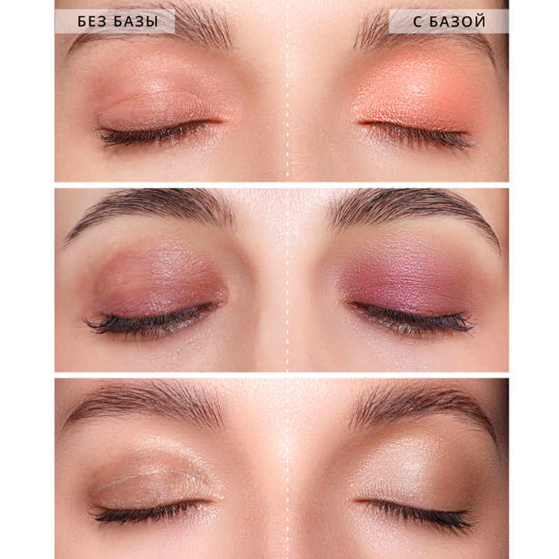 Натуральный бежевый оттенок базы тонирует и выравнивает кожу век, скрывает мелкие несовершенства.