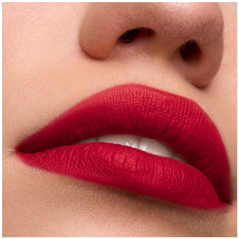 Жидкая флюидная текстура помады быстро высыхает после нанесения и создает невесомое покрытие с ультра матовым финишем.