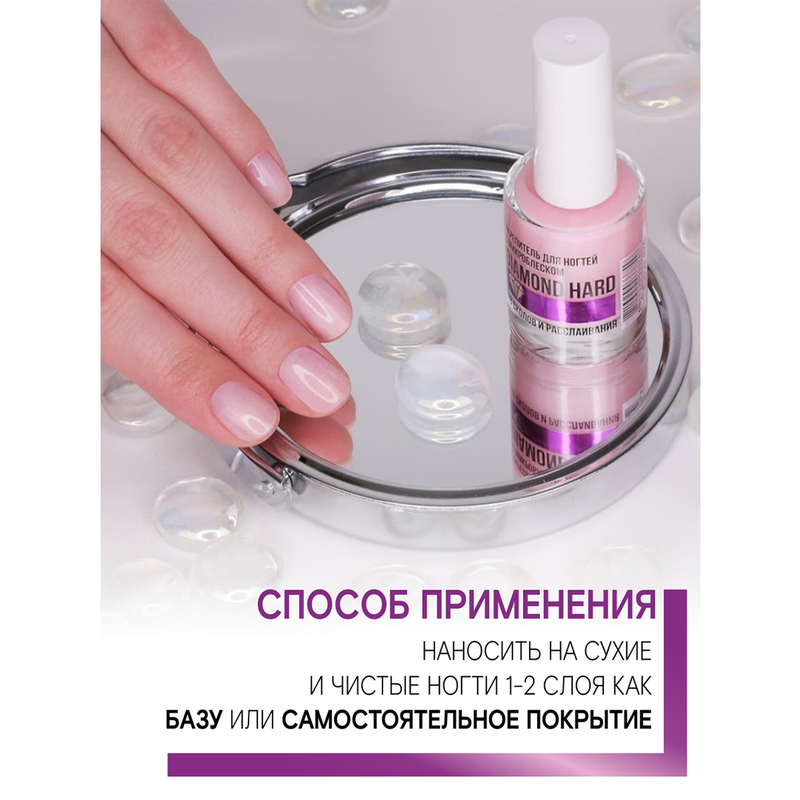 Наносить на сухие и чистые ногти 1-2 слоя как базу или самостоятельное покрытие.