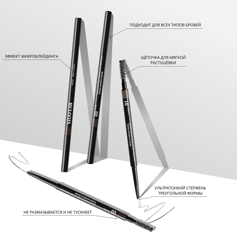 Ультратонкий треугольный стержень создает тончайшие штрихи, которые позволяют имитировать натуральный волос. Идеален для заполнения цветом менее густых участков бровей. Форма грифеля делает продукт многофункциональным: плоская сторона карандаша подходит для прорисовки формы, быстрого и легкого заполнения бровей цветом, заостренная – для тонких штрихов, имитирующих волоски