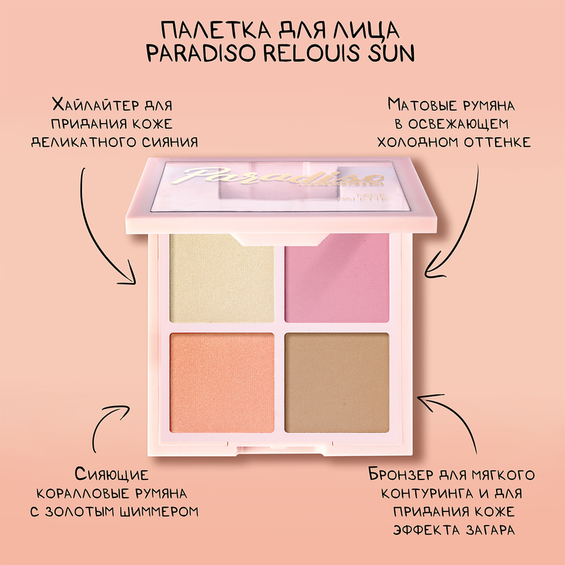 4 бронзер universal bronzer – универсальный идеальный оттенок скульптурирующего бронзера. Можно использовать и для контуринга, и объёмной кистью для придания коже эффекта легкого загара! Не рыжит, не пятнит. Подойдёт девушкам и со светлой, и с более загорелой кожей.Мы специально разработали и подобрали все оттенки и текстуры таким образом, чтобы каждая девушка могла с удовольствием пользоваться новой палеткой для лица Paradiso Relouis каждый день и выглядеть неотразимо!