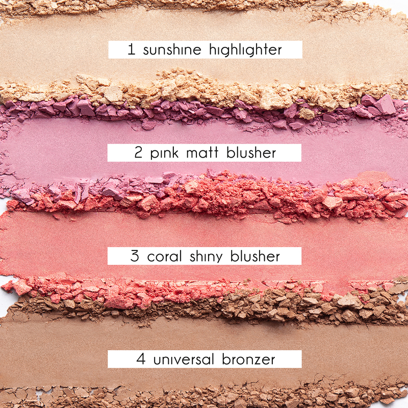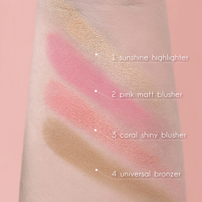 Все оттенки можно использовать и для оформления лица, и как тени на глаза. А также смешивать между собой! Попробуй оттенки по отдельности и смешайте все 4 текстуры для получения уникального пятого цвета румян!
