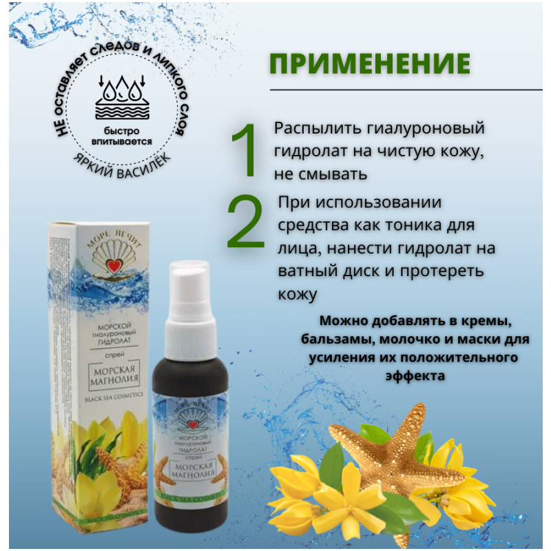 Гиалуроновая кислота НА-TLM 200-400KDa, гидролат магнолии, очищенная морская вода.