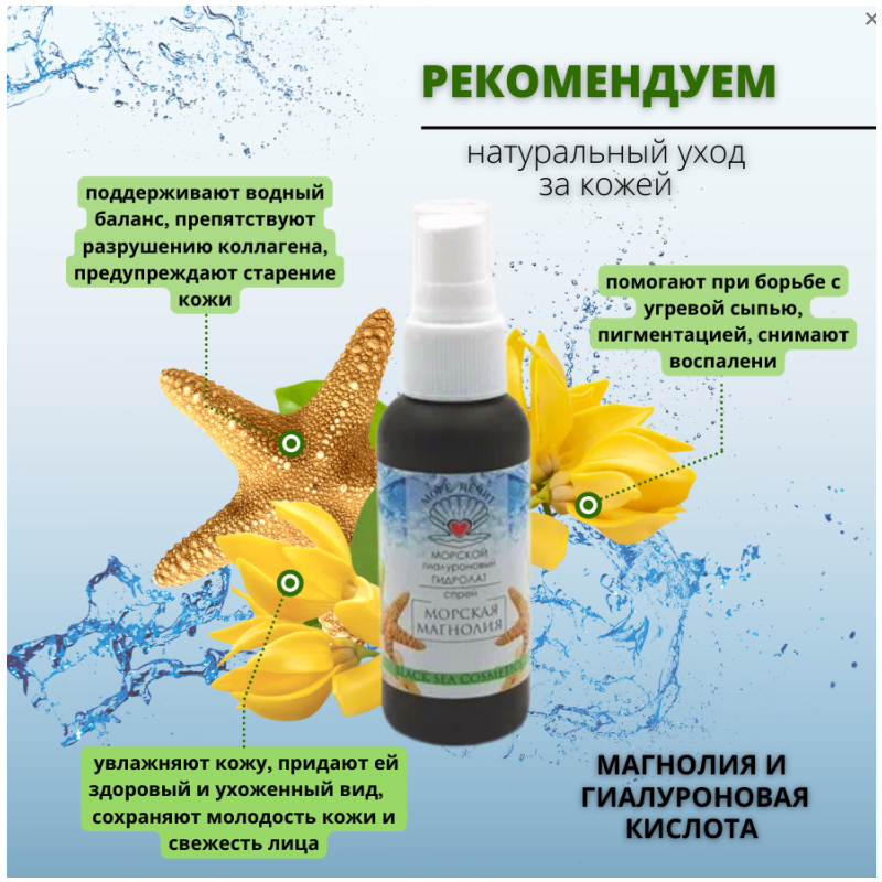 Гиалуроновый гидролат "Морская магнолия" прекрасно увлажняет кожу, придает ей здоровый и ухоженный вид. Гиалуроновая кислота одно из важнейших веществ, способных надолго сохранить молодость кожи и свежесть лица. Поддерживает водный баланс, препятствует разрушению коллагена, предупреждает старение кожи. Магнолия обладает бактерицидными свойствами, помогает при борьбе с угревой сыпью, пигментацией, снимает воспаления. Великолепно защищает кожу от негативного воздействия ультрафиолетовых лучей. Более того, гидролат способен снизить уже причиненный ультрафиолетом вред. Приятный аромат гидролата оказывает ароматерапевтический эффект, расслабляет организм и нервную систему. Морской гидролат магнолии подарит Вам ощущение свежести и прохлады!