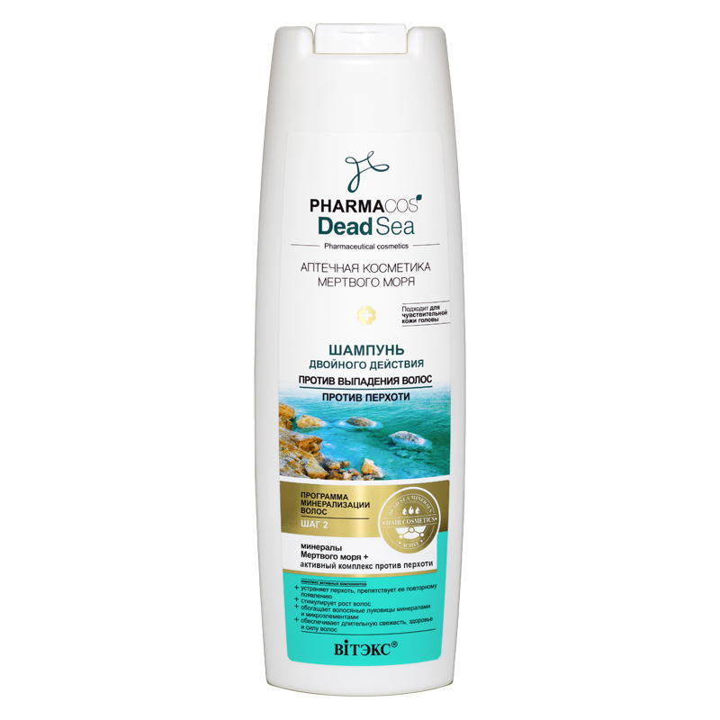 Шампунь двойного действия деликатно очищает волосы и, благодаря синергетическому действию целительной эссенции из 20 минералов Мертвого моря, запатентованного комплекса для роста волос и активного комплекса против перхоти, эффективно помогает направленному решению двух проблем: перхоть и выпадение волос.