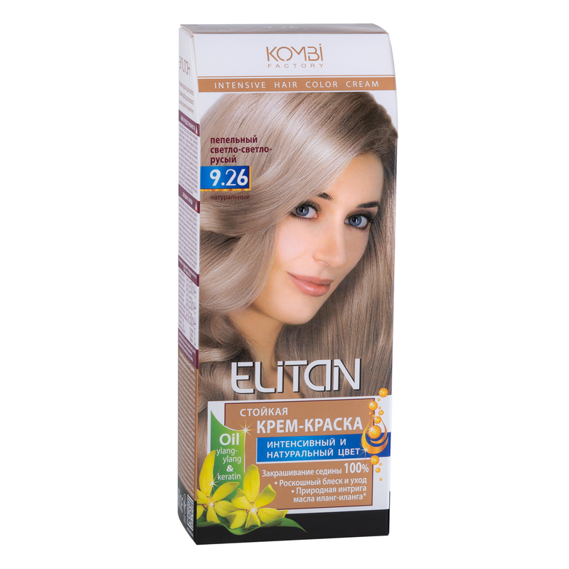 Крем-краска для волос Элитан.Стойкая крем-краска, обладает интенсивным и натуральним цветом. На 100% закрашивает седину. Придаёт волосам роскошний блеск.