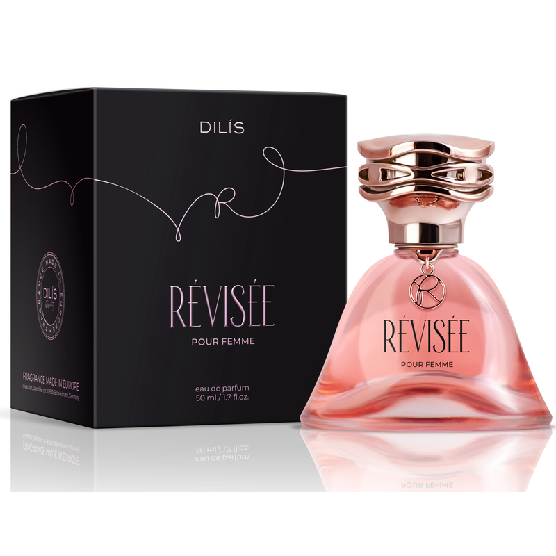 Тонкая летящая линия образует букву «R» и напоминает изящный бант, украшая черный футляр и подвеску на флаконе в оттенке розового золота, отражая утонченность аромата, а нежный розовый флакон подчеркивает женственность и игривость Révisée.
