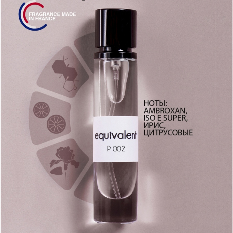 "EQUIVALENT" P002 практически невесом, неощутим, до тех пор, пока не станет завершающим штрихом композиции. Воплощение тонкости Востока достигается сложным аккордом амброксана – он удивительно мягкий, насыщенный и, одновременно, подчеркивающе-нежный, что помогает бархатистым ноткам оттенять шарм обладательницы и создавать свой собственный флер, пленяя окружающих минеральной деликатностью, завершающего композицию аромата.