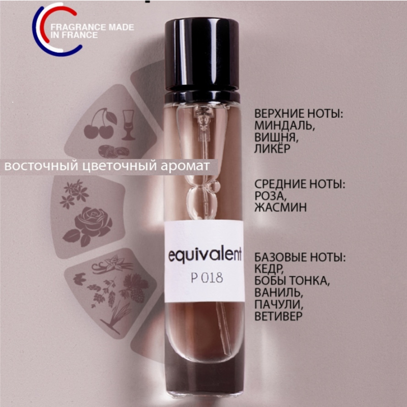 Верхние ноты аромата, собранные букетом из томной черешни и масла горького миндаля, удивляют своей внешней гладкостью и блеском восприятия, и приятной бархатистостью, кроющейся за слепящей оболочкой. И действительно, чем глубже погружение в оттенки "EQUIVALENT" P018, тем удивительней ощущение контраста – бархатистая турецкая роза переплетается с сиропом из вишни, знаменитым «гриотом». Завершает ансамбль незаменимая база – чувственный перуанский бальзам гармонирует с глубоким вкусом обжаренных бобов тонка, добавляя изюминкой сандаловое дерево, приглушенное кедром. Удивительный аромат соблазняет, дает волю фантазии, построенной на контрасте игривости и желания, утягивает за собой в водоворот незнакомой ранее силы страсти.