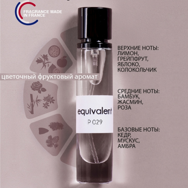 Думаете, это повеяло солнечным побережьем Средиземного моря? Вы правы только на половину - да, запах морских берегов вы угадали верно, но нет, мы не в Италии - это просто "EQUIVALENT" P029 окутывает своим легким флером. Бамбук в одном аккорде с жасмином и яблоко Гренни Смит, напитанное сицилийским кедром, - деревом, воплощающим в себе полуденное спокойствие и умиротворение морских берегов, открывают нам возможность коснуться солнечных дней и привнести в свою жизнь тепло отполированной временем гальки и шелест щекочущей пятки волны. Свежести в аромат добавляют переливы колокольчиков, над которыми, томительной притягательностью колышатся ветки лимонного дерева. Завершает композицию мускус - он объединяет, приглушает кричащие аккорды и открывает возможности нежных, запрятанных нот. Он словно говорит - вот он, аромат, предназначенный для тебя.