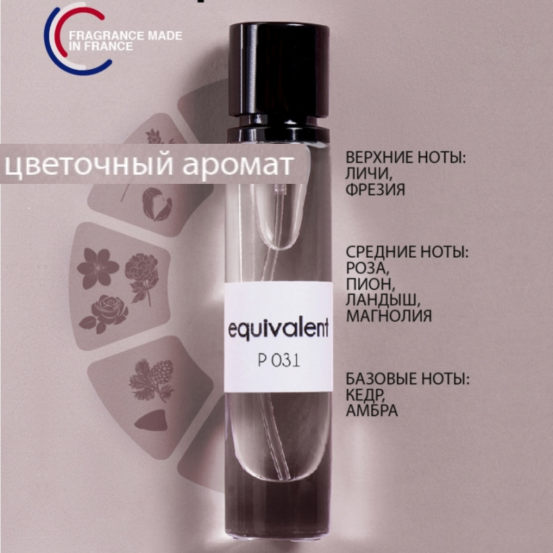 Пронзительный звон весеннего утра, купающегося в каплях росы на листьях ландыша и упивающегося девственной чистотой чайной розы, плотно упрятан во флакон перед вами. "EQUIVALENT" P031 - это про майскую нежность, про чистую, юношескую женственность, про свежесть и удивительную простоту, в которой бутонами раскрывается настоящая красота. Сверху, над каскадом торжества нежности, сводами переплетаются чарующие магнолии, томные пионы и мощные вирджинские кедры. Нотку экзотичности, удивительного собственного очарования вносит дуэт личи с белой фрезией. Изысканность в своем чистом воплощении готова стать вашей спутницей на любом мероприятии.